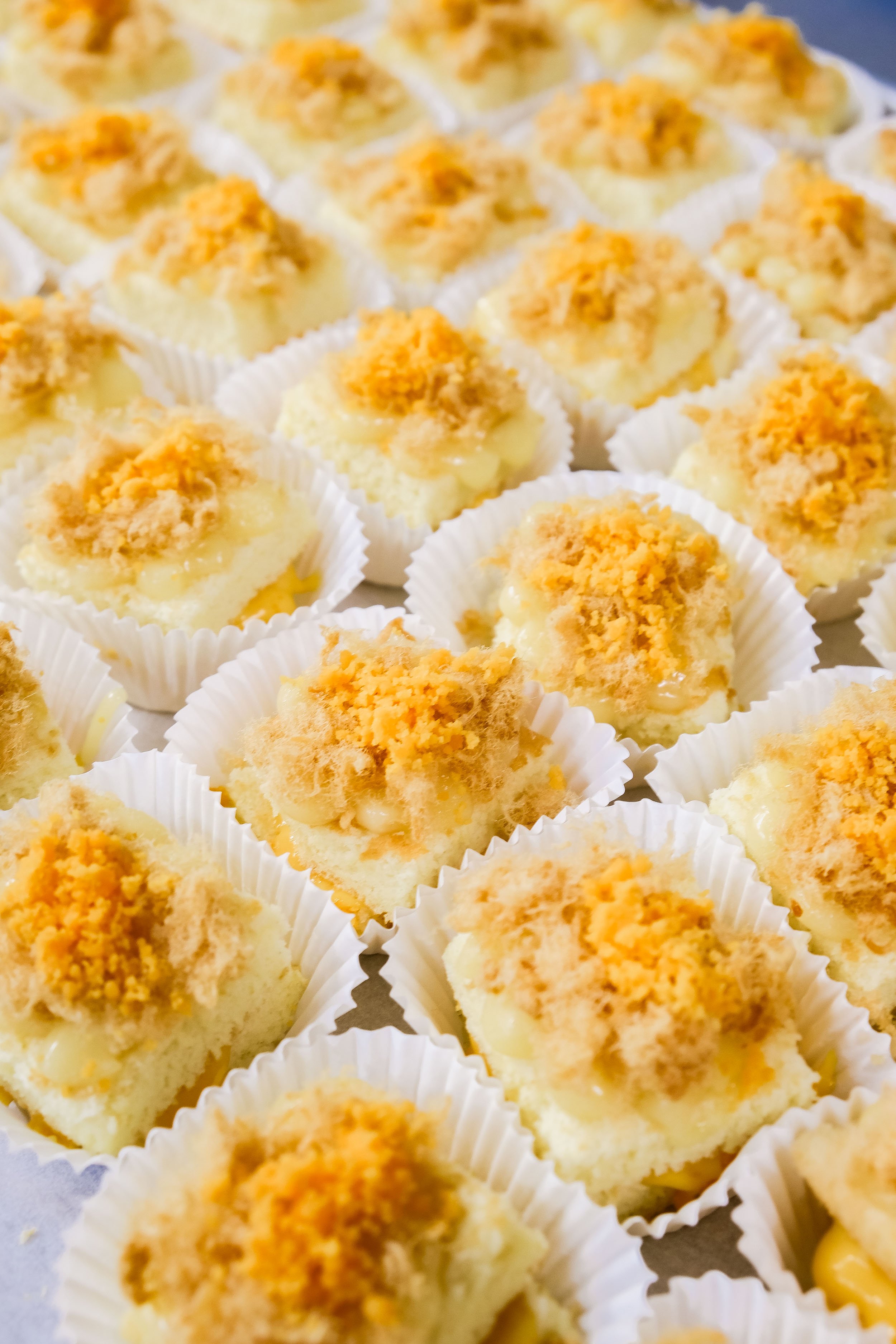 We use nostalgic ingredients that will make the kid (and adult) in you smile with joy. Compared to Western desserts, ours are a touch less sweet and balanced with a hint of salt. Distinctive ingredients we use include salted egg yolk, durian, and pork floss.